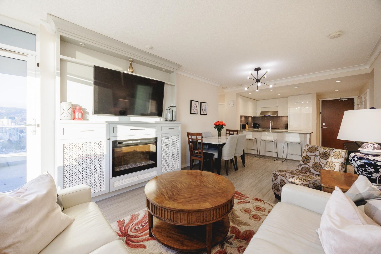 ASK YOUR REALTOR! Almost SQF 950 in Polygon built high rise located in central Coquitlam with walking distance access to skytrain and shopping centre, 2 separate bedrooms, fireplace, beautiful views of mountain and city, good size balcony, updated and well maintained unit, amenities include: gym, pool, Hot Tub, party room, game rooms, Volleyball & courts, Guest Suite, craft room, etc. all in a separate standing building with concierge. 1 parking and 1 storage.